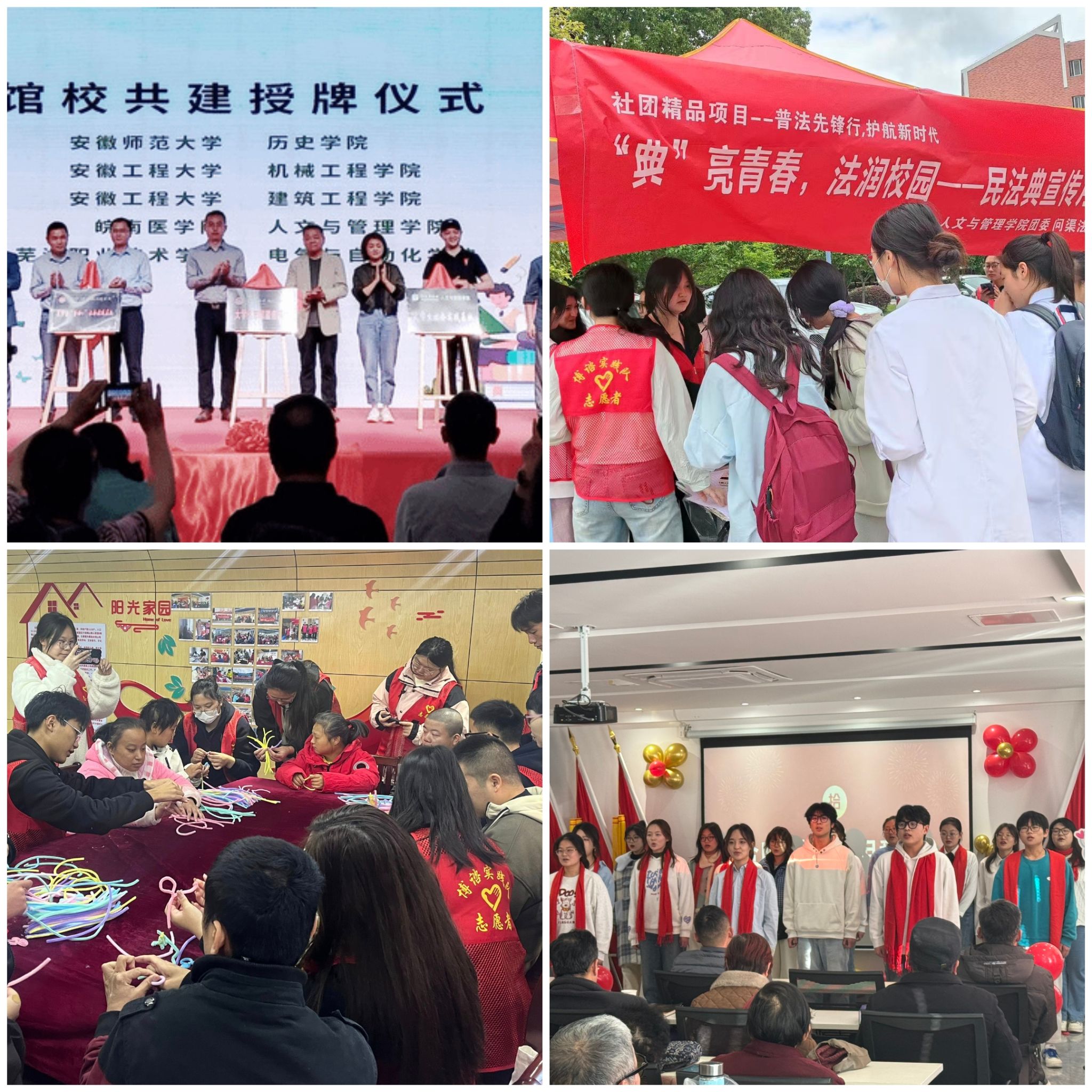 ‌立足专业优势,以“博谘志愿服务队为核心引擎,通过青春法治行、心梦、筑梦青春、幸福葆四大特色分队深耕社会服务领域,活动获中国青年报、安徽新闻网、芜湖新闻网等10余家主流媒体50余次专题报道,其中 "筑梦青春·致敬消防"项目入围全省十佳消防志愿服务项目评选(全省仅20席)。通过"专业赋能+实践育人"双轮驱动,志愿服务队每年平均开展活动90余场次,累计服务时长逾22700小时,惠及群众8600余人次。