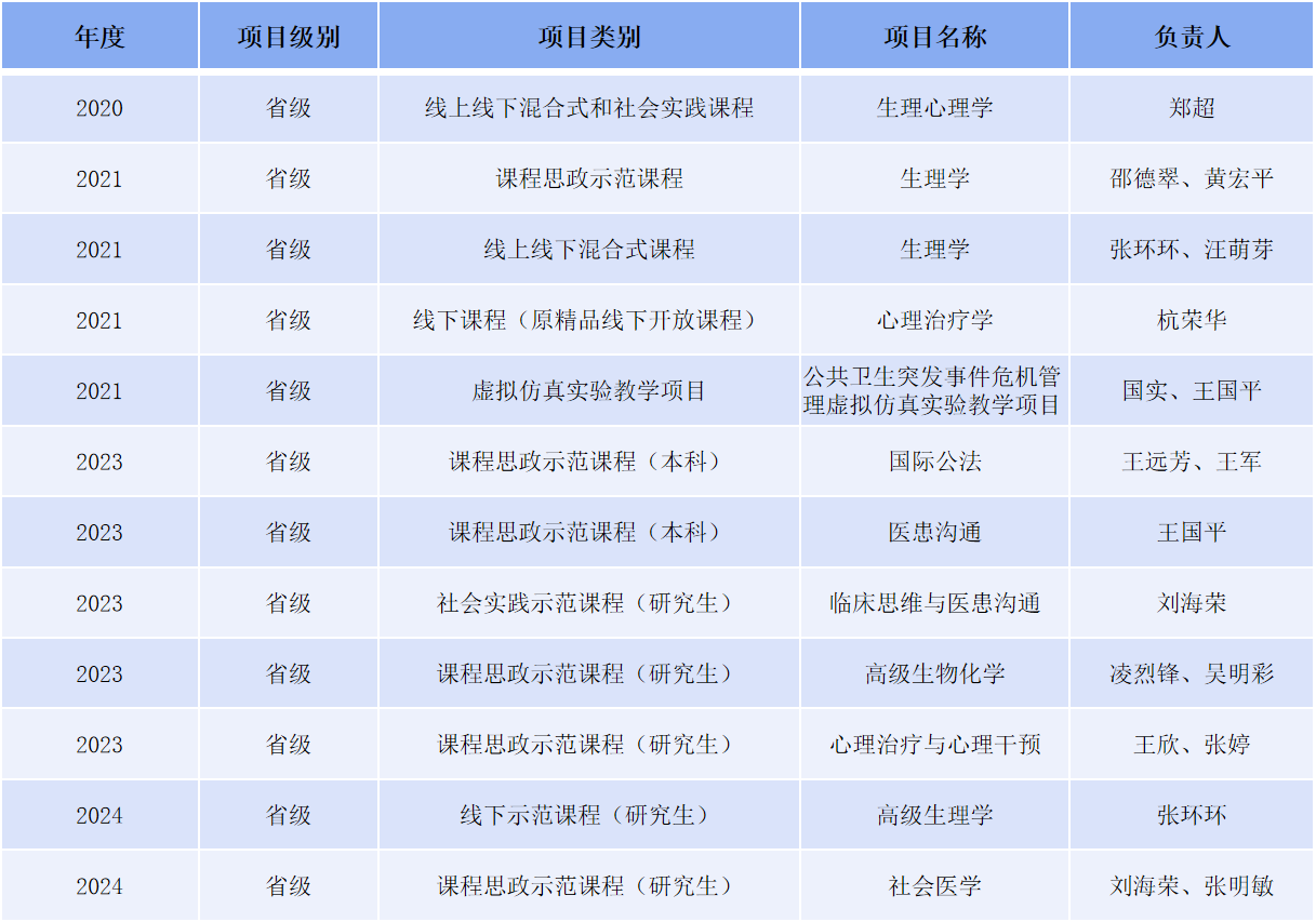课程建设创新实践。学院深度对接"健康中国"战略需求,系统构建"医学+"课程体系。聚焦复合型人才培养目标,建设医学与法学交叉课程群(《卫生法学》《医事法》等)、医学与管理学融合课程群(《医院管理学》《卫生政策学》等)、医学与心理学贯通课程群(《医学心理学》《心理治疗学》等)、医学与保险学交叉课程群《医疗保险学》),形成特色鲜明的跨学科课程矩阵。通过跨学科教学研讨,提升课程内容与医疗卫生行业发展的契合度。“十四五期间,获批《心理治疗学》《生理心理学》《社会医学》《国际公法》等12门省级一流建设课程,主编/副主编《医学心理学》等国家级规划教材8部、省级规划教材3部,参与编写行业特色教材13部,构建起"精品课程-优质教材-实践案例"三位一体的教学资源体系。