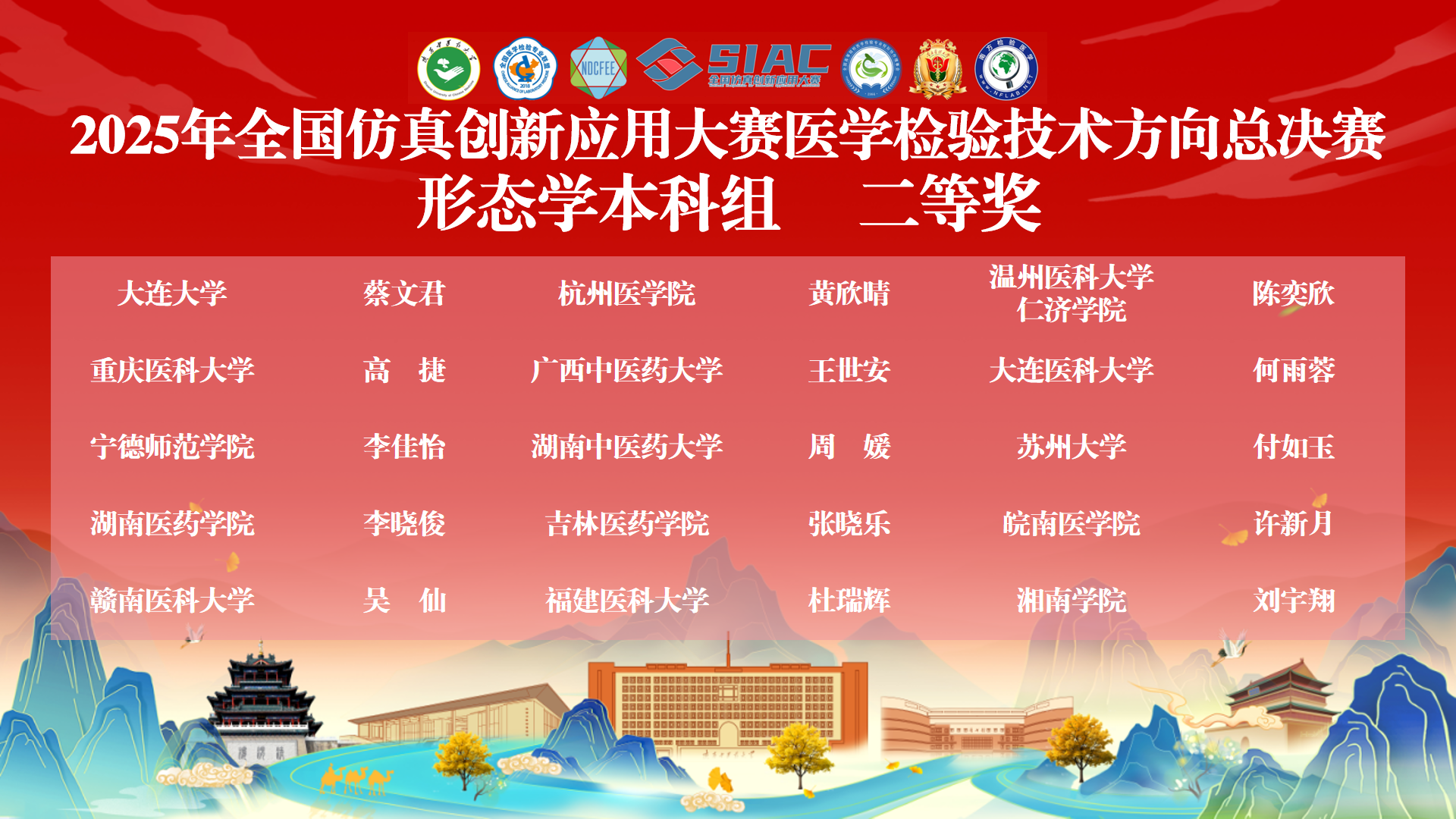 此次全国仿真创新应用大赛共吸引了全国32个省、自治区、直辖市、特别行政区230所高校的1682名学生参加。我校学子积极备赛,在今年5月份举行的省赛中,2022级医学检验技术专业学生许新月、王睿君均获形态学大赛省赛一等奖,并将代表我校参加全国总决赛。经过2个多月刻苦训练和积极备战,两名同学不畏强手如林,凭借扎实的专业功底和良好的心理素质,从近200名选手中脱颖而出,分获形态学本科组大赛二等奖和三等奖。