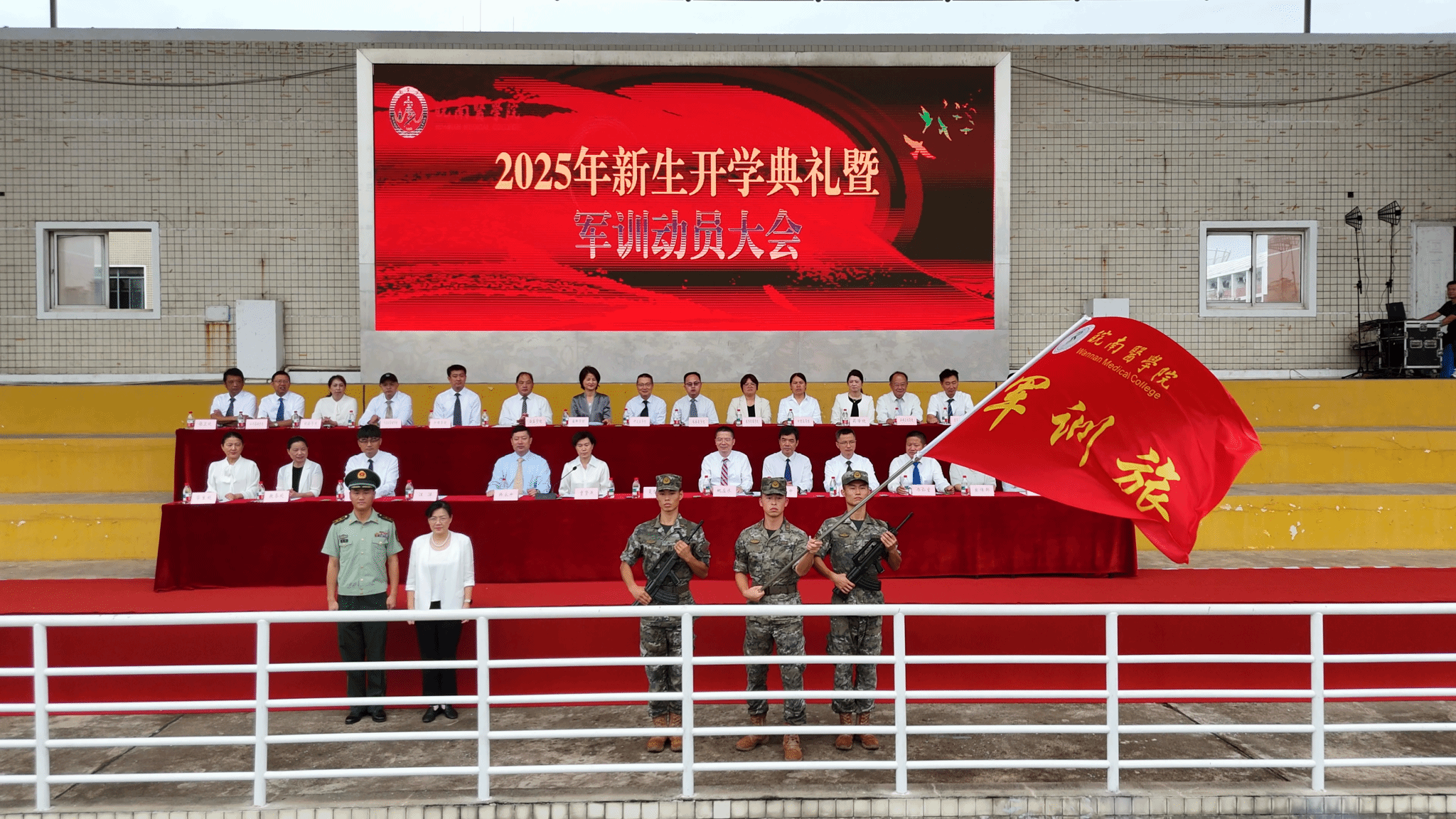 精医报国担使命,迷彩青春启新程。9月11日上午,我校在滨江校区(北区)田径场隆重举行2025级新生开学典礼暨军训动员大会。在校校领导夏劲松、姚应水、贾贤燕、王保中、韩永升、余结根,武警芜湖支队中校参谋长汪洋出席大会。大会由党委副书记贾贤燕主持。