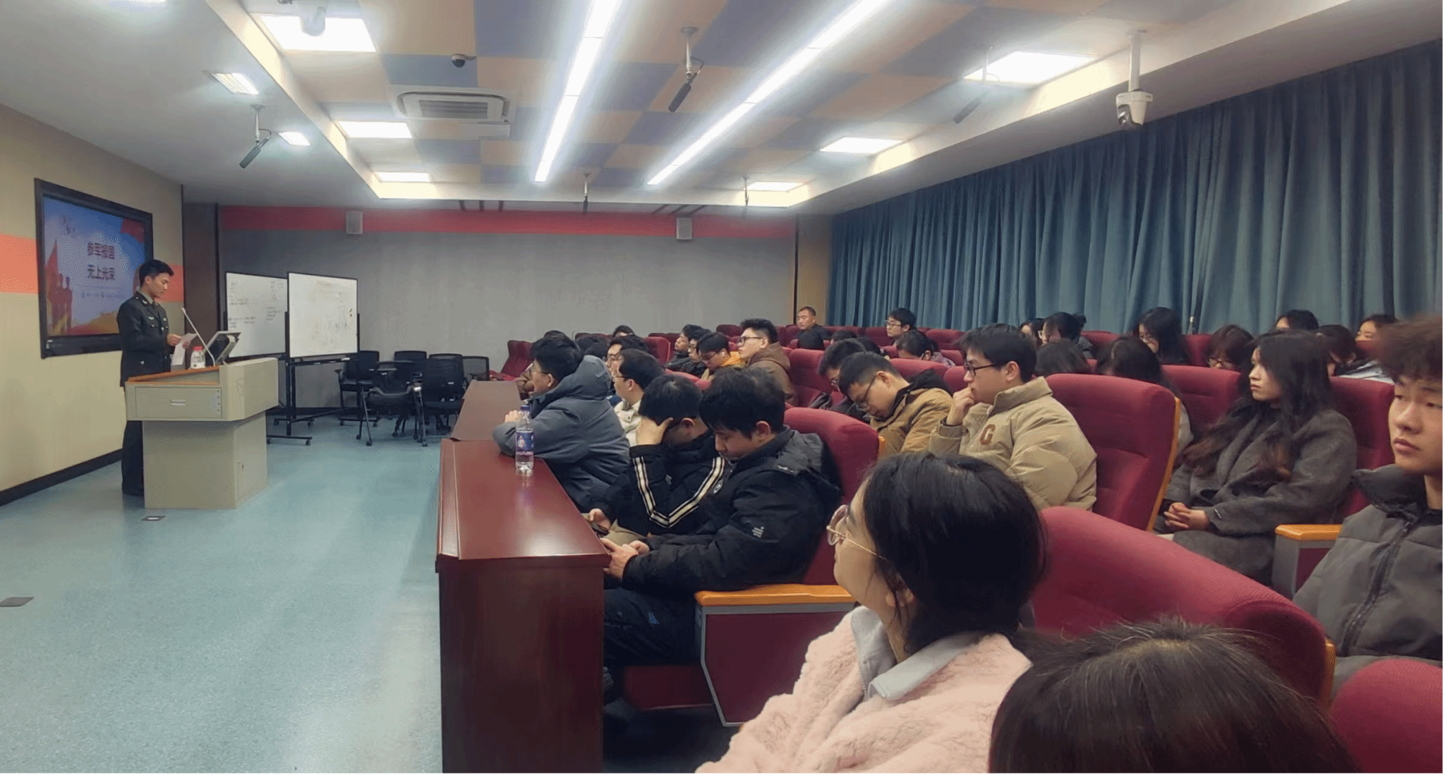 武宇洋老师详细解读了大学生应征入伍的意义、应征条件、入伍政策、发展前景、退役安置和经济待遇等方面内容,帮助同学们更深切体会党和国家对军人的优惠政策,勉励同学们积极响应党和国家号召,投笔从戎,勇担重任。刘俊同学结合自己在部队的经历以及收获和现场同学进行了交流分享,鼓励同学们积极响应国家号召,投身国防事业,为国家的繁荣富强贡献自己的力量。