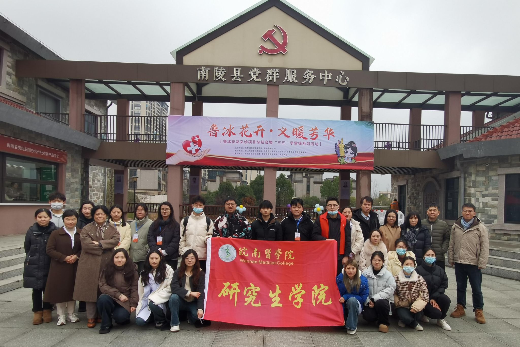 为学习贯彻习近平新时代中国特色社会主义思想,引领广大青年在社会实践中学习并践行雷锋精神,3月4日,研究生学院党委联合校团委、一附院赴南陵县城东芜湖市党的组织生活教育馆开展鲁冰花和义诊项目总结会暨“3·5”学雷锋系列活动。校团委书记饶婷婷,研究生学院党委副书记、副院长戴照福,一附院教育处主任童九翠,13位一附院专家和22名学生志愿者共同参与活动。
