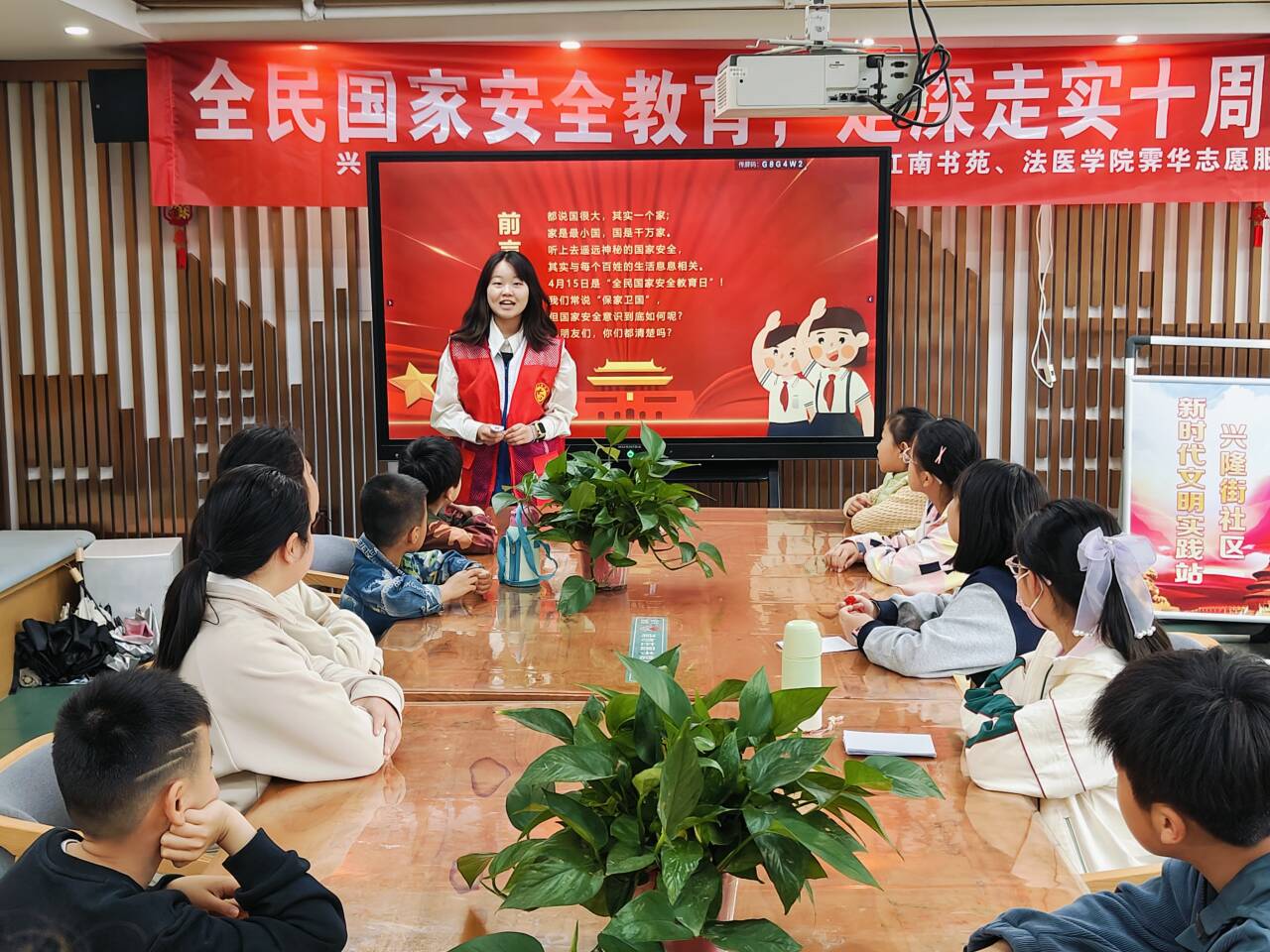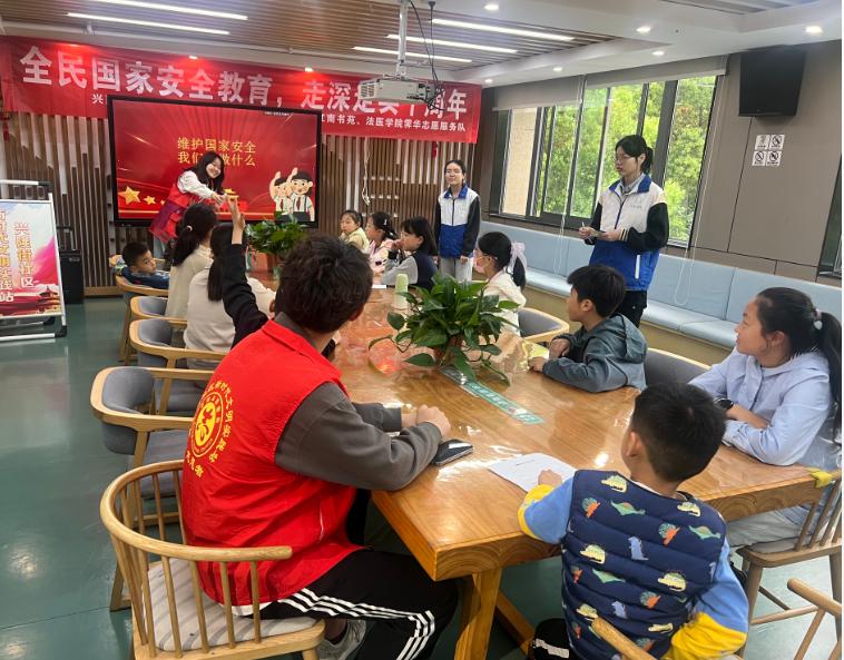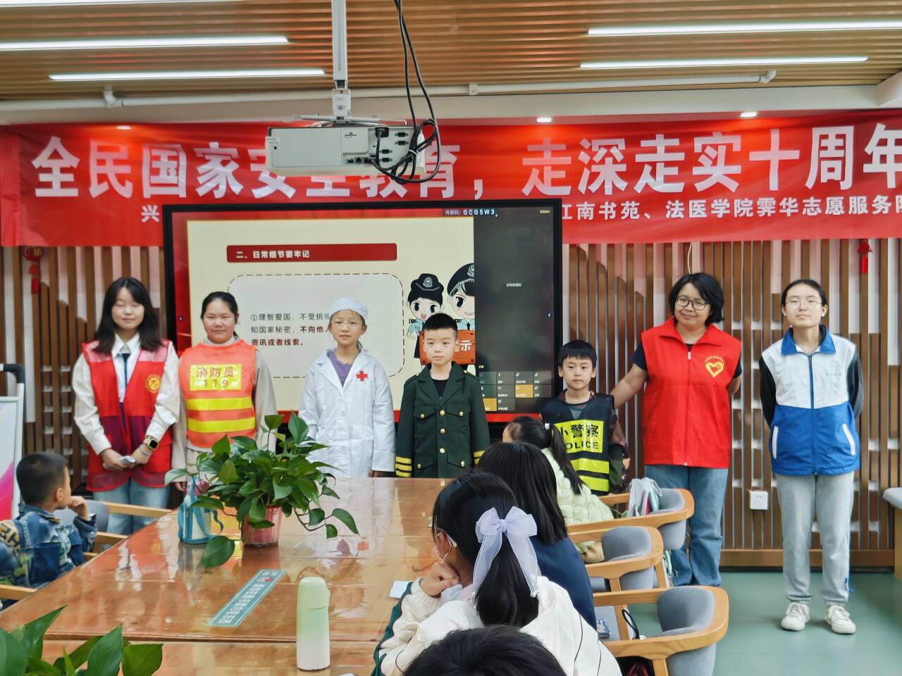 在第十个全民国家安全教育日到来之际,4月12日上午,法医学院霁华志愿服务队联合兴隆街社区,在弋江南书苑开展“小手拉大手  共筑安全梦”全民国家安全教育日主题实践活动。大学生志愿者通过知识宣讲、互动问答、角色扮演、创意绘画等丰富形式,为社区小朋友们带来了一场别开生面的国家安全教育课。