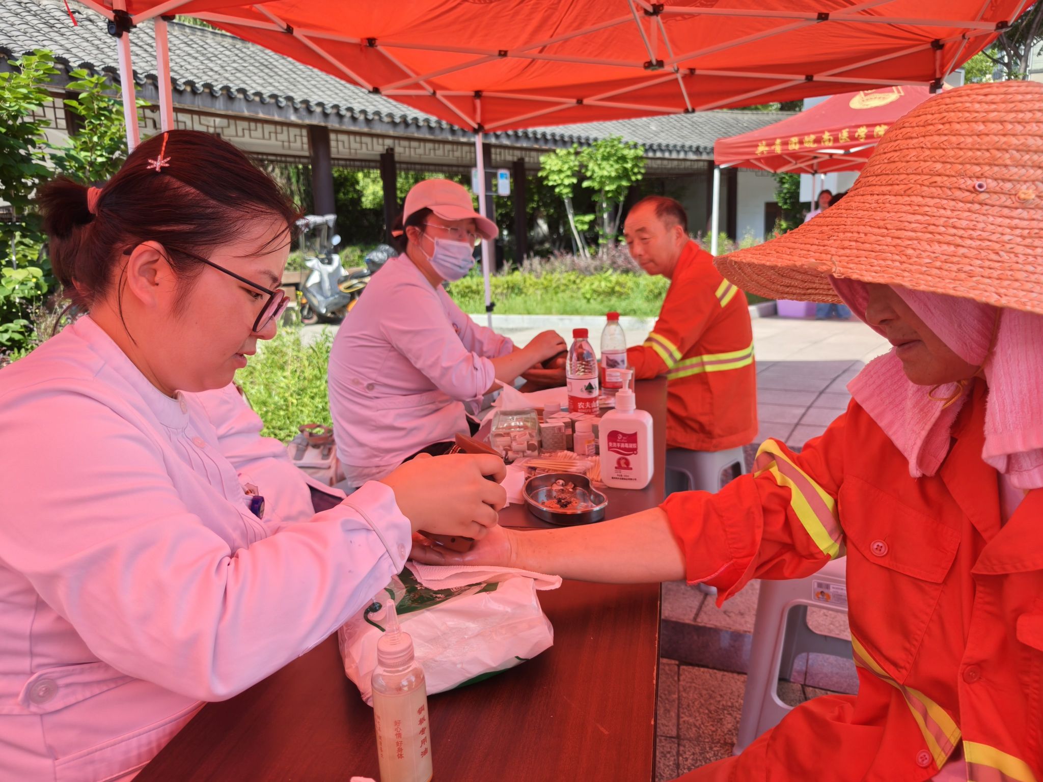 7月1日上午七时整,实践团全员整队出发前往弋江区南瑞街道,联合附院专家开展“双报到”活动,将“专家+大学生”的健康服务品牌送到南瑞沐荷园社区的群众“家门口”,为闻讯前来的300余名居民提供血压、血糖、视力等基础健康体检项目。来自附院的临床专家耐心细致地为居民们提供诊疗咨询和用药指导,并在现场设置“中医特色诊疗”体验区,让居民亲身体验把脉问诊、耳穴压豆等传统中医项目。义诊活动现场的另一边,实践团队员们搭起了“杏林小讲堂”,用通俗易懂的语言配合生动形象的演示,为社区居民带来了我校第四届医学人文节医学微课比赛遴选打造的医学科普金课“‘救’在身边”。队员们化身“安全导师”利用模拟人教具,详细讲解了心肺复苏术、人工呼吸、海姆立克急救法等急救知识和技能,为现场的大人和小朋友们送上了一堂“听得懂、学得会、用得上”的急救科普课。义诊现场,环卫工人张大姐感慨道:“我们每天在外面干活,风吹日晒,今天能有免费检查和治疗,真的太感谢你们了!”