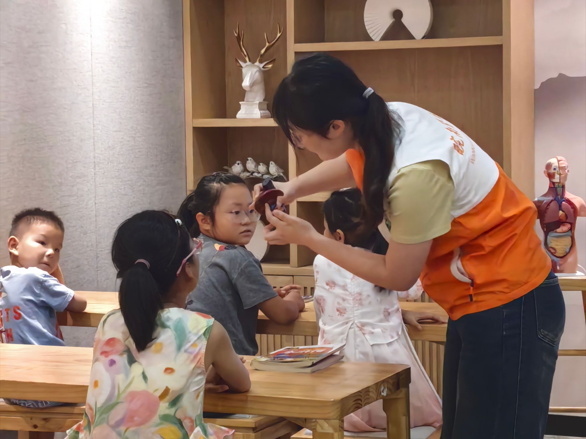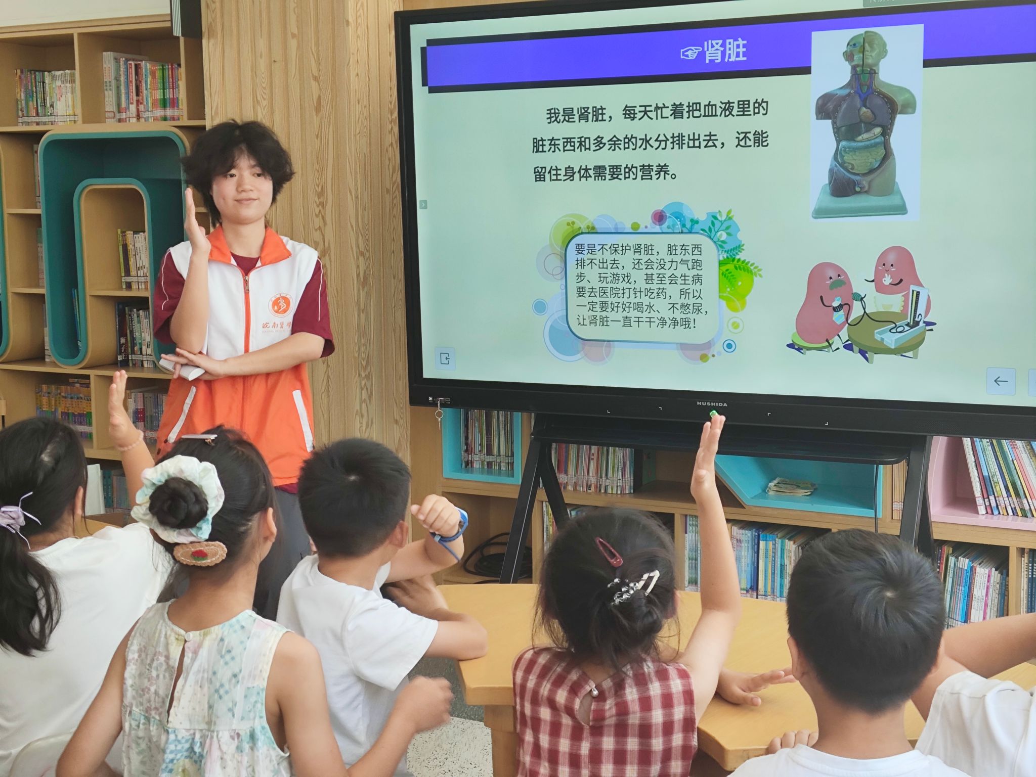 6月29日至7月6日,“青马”社会实践团的42名同学组成书院宣讲小分队,每天头顶烈日、脚踏热浪,前往芜湖弋江南书苑、滨江书苑、麓枫书苑等书院,开展了为期8天17场的“健康中国·科学膳食”主题宣讲活动,服务群众430余名。实践队员创新采用"理论+体验"模式,聚焦"三减三健"的核心理念,以通俗易懂的语言讲解慢性病防治和健康膳食等医学科普知识,同时设置了“食品添加剂我来认”“健康餐盘我来配”等趣味互动环节。活动博得了孩子与家长们的一致青睐,课程结束一位陪同家长更是感慨道:“原来少放一勺盐就是护心良方!”