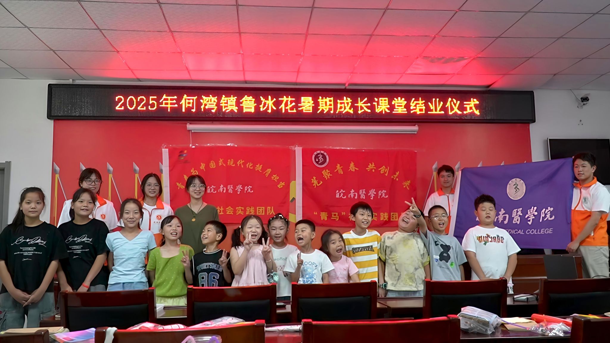 “姐姐,我们将来也要考你们皖医!”最后一节鲁冰花暑期课堂结束后,孩子们与实践团队员不舍道别。6月30-7月4日,获批2025年“芜聚青春 共创未来”芜湖市重点大学生社会实践团队的“青马”社会实践团的8名成员组队前往南陵县何湾镇与烟墩镇两地鲁冰花小屋开展了为期5天的“鲁冰花开,童心筑梦”鲁冰花暑期成长课堂活动,为当地50余名留守儿童打造了一个“以德育心、以智慧心、以体强心、以美润心、以劳健心”为主题的“七彩假期”。团队成员结合南陵县传统非遗、药材之乡、英雄故里等特色教育资源,聚焦儿童心理健康关爱开展了杏林小讲堂、悄悄话漂流瓶、我的幸福泡泡、中医八段锦等突出医学特色的多样化课程。